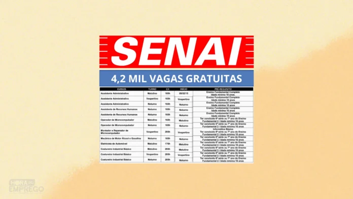O Serviço Nacional de Aprendizagem Industrial (Senai) está com inscrições abertas para 20 cursos gratuitos de qualificação profissional. As oportunidades compreendem as áreas de gestão, saúde, educação, beleza, direito, recursos humanos, entre outros. As inscrições são realizadas pela internet.