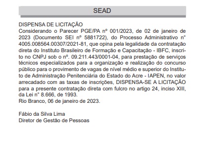 Foi publicado na manhã desta segunda-feira, 09, mais uma fase do concurso da Polícia Penal do Acre, que prevê 260 vagas. Por meio de dispensa de licitação, o governo do Acre escolheu a banca IBFC para realizar as fases do concurso. Após esta fase de escolha da banca, o próximo passo será o lançamento do edital com as regras do certame.