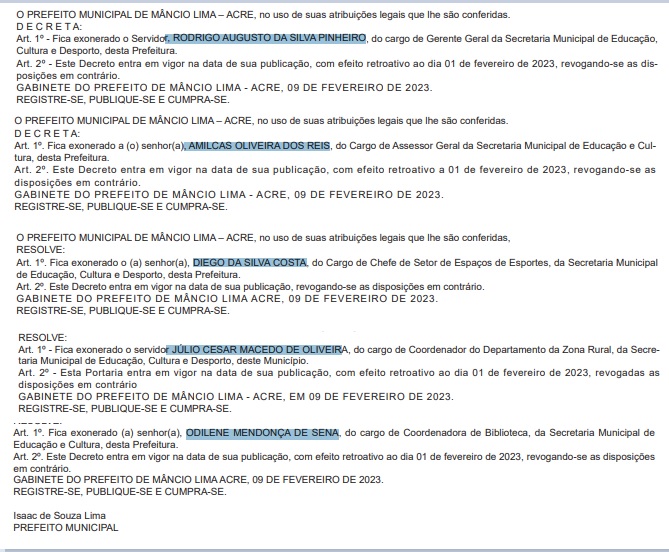 Na edição do Diário Oficial de hoje, foram demitidos mais cinco pessoas da prefeitura de Mâncio Lima, incluindo um sobrinho de Eriton Maia.