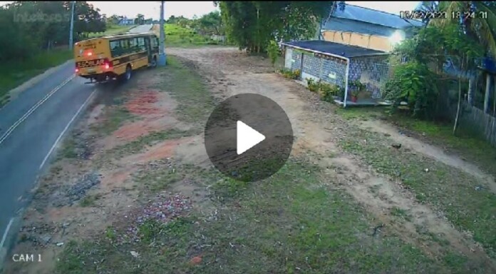 As câmeras de segurança de um comércio no bairro Pé da Terra, em Mâncio Lima, registraram o exato momento em que um ônibus escolar com alunos sai da Avenida Japiim e quase se choca contra um poste da rede elétrica.
