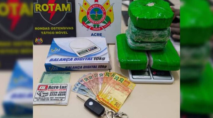 Uma guarnição da Companhia Rotam, do Batalhão de Operações Especiais (Bope) da PMAC, prendeu uma mulher na tarde desta quinta-feira (16), com mais de 5,5 kg de drogas, após uma abordagem a um veículo suspeito no bairro Jardim Europa.