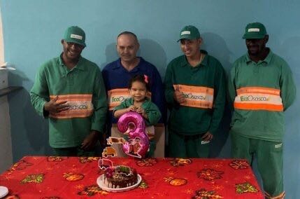 A menina cumpriu a promessa. Cantou o parabéns com os garis e deu o primeiro pedaço de bolo para um deles. Ela também posou para fotos, além de dar um passeio na boleia do caminhão de coleta.