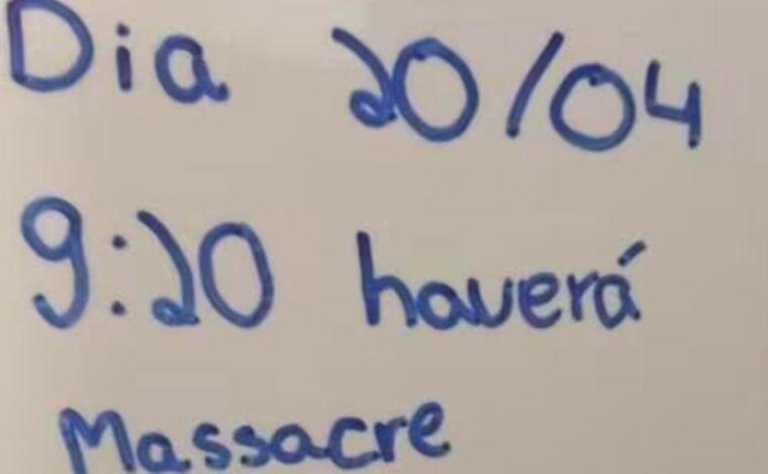 Um adolescente de 17 anos foi apreendido nesta quinta-feira (13) suspeito de ter escrito ameaças de massacre na parede do banheiro masculino de uma escola no bairro Primeiro de Maio, na região Norte de Belo Horizonte. Ele teria escrito a data e o horário em que ocorreria o massacre, além de afirmar que a diretora do colégio seria a primeira a ser atingida e que “ninguém seria poupado”.