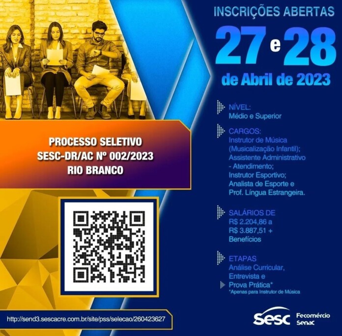 Terminam nesta sexta-feira, 28, até às 23h59min, as inscrições no processo seletivo do Serviço Social do Comércio (Sesc) no Acre. O certame tem como objetivo, o preenchimento de vagas efetivas e formação de cadastro de reserva em cargos de nível médio e superior, para a cidade de Rio Branco.
