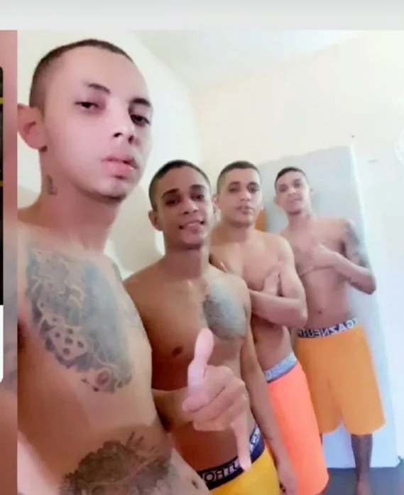 Na fotografia aparecem quatro internos que fazem sinal de positivo. Eles usam uniforme amarelo e mostram tatuagens. É possível observar também o ambiente da cela.