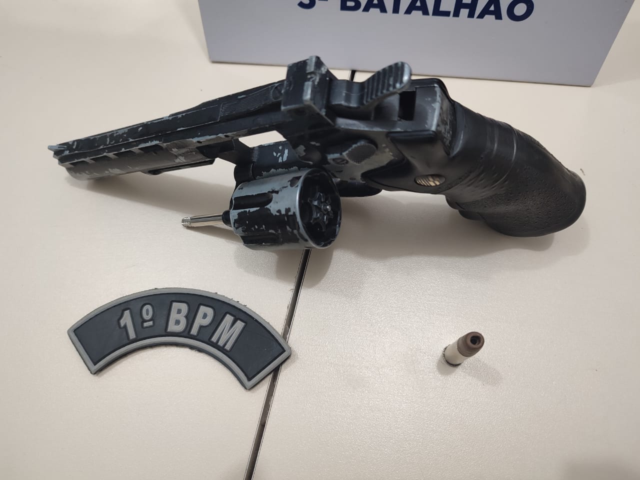 Os militares foram acionados por uma vítima de tentativa de roubo, que relatou que estava em direção à sua casa, quando dois indivíduos em uma motocicleta tentaram assaltá-lo, em posse de um revólver .38. A vítima, que é policial civil, conseguiu evitar o assalto, e os criminosos fugiram a pé, abandonando a moto e a arma de fogo.