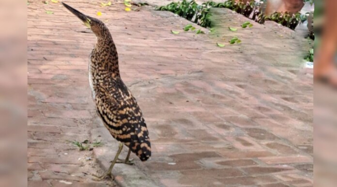 A cena foi registrada por câmeras de celulares. As imagens mostram o socó-boi voando baixo, próximo aos prédios e às pessoas que estavam na rua.