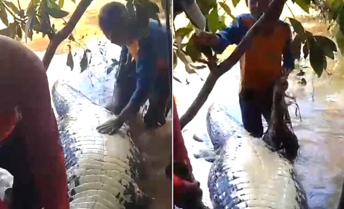 O vídeo mostra dois homens ao lado do jacaré abatido, que mede mais de 4 metros. Um dos pescadores chega a bater na barriga do animal e comemorar o feito, mencionando que é parte de sua rotina no rio Iquiri.