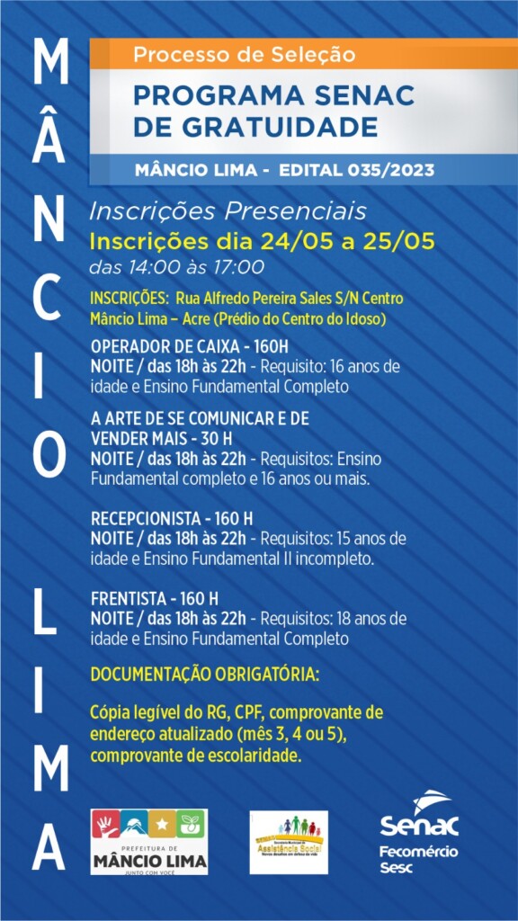 Estão abertas as inscrições para os cursos de operador de caixa, curso de vendas e comunicação, frentista e recepcionista para os jovens de Mâncio Lima. A iniciativa faz parte do programa Senac de Gratuidade.