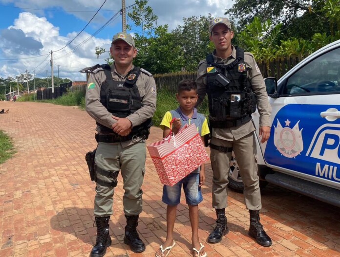 O garoto Jardeson Souza Coelho, 9 anos, foi surpreendido com um presente entregue, nessa quarta-feira (7), pelos policiais do 8º Batalhão da Polícia Militar de Sena Madureira, no interior do Acre.