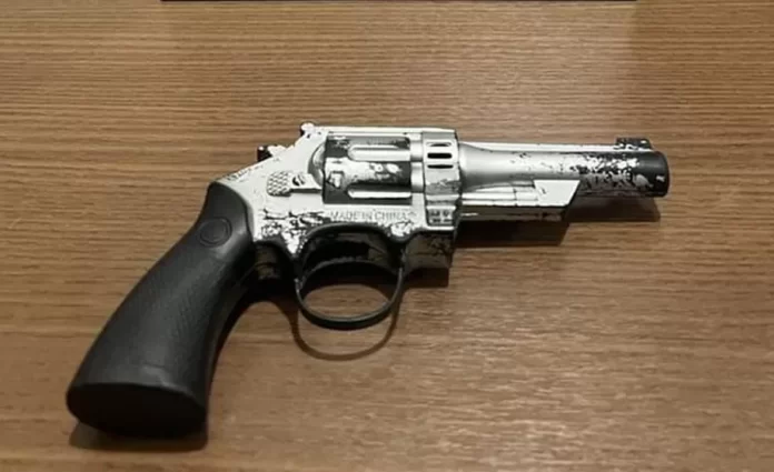 No local, os agentes de segurança ficaram surpresos, já que o suspeito era um adolescente de 12 anos, que portava o simulacro de um revólver.