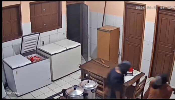 Dois indivíduos foram flagrados pela câmera de segurança da cantina roubando o freezer e a geladeira. Nas imagens é possível observar que um deles está com o rosto coberto e o outro sem blusa.
