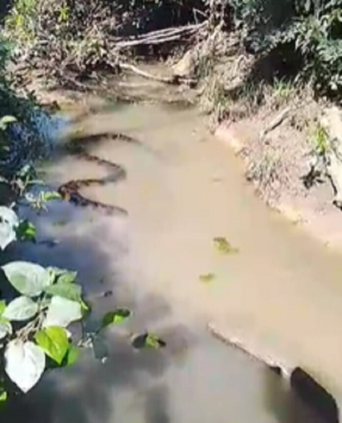 Um grupo de moradores gravou o exato momento em que a cobra ‘desfilava’ pelas águas do igarapé e um deles ficou encantado com a cobra: “Que coisa linda!”, comentou.