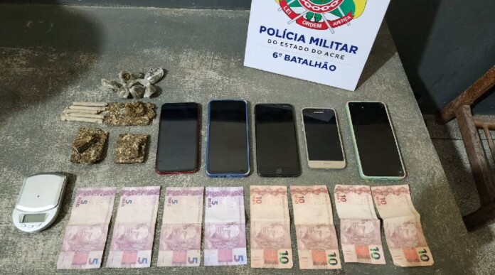 Após o cerco feito com o apoio das guarnições de Rádio Patrulha, o indivíduo foi capturado e foi encontrada a sacola que ele havia jogado, contendo 5 celulares, 95 gramas de maconha, 60 reais em espécie e 01 balança de precisão.