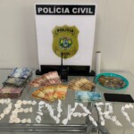 Foram apreendidos na residência do suspeito: 29 invólucros plásticos de substância entorpecente do tipo oxidado de cocaína, pesando 145g; 52 invólucros plásticos de substância entorpecente do tipo cocaína, pesando 260g; 01 veículo Ford Fiesta cor vermelha; R$ 2.328,90 em espécie e 01 rádio comunicador.