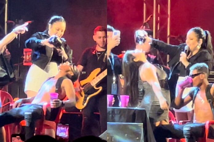A cantora chamou cinco acreanos para subir ao palco e participar de uma performance com whisky na boca, despejado pela própria Mari Fernandez.