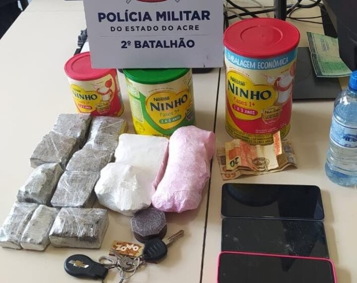 Durante uma revista veicular, os policiais encontraram latas de leite em pó com uma substância aparentando ser cocaína e skank (supermaconha), a droga pesou quase dois quilos.