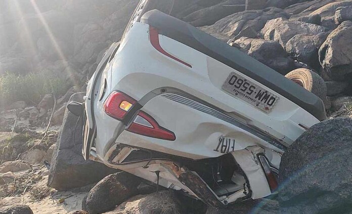 Ao acelerar, o carro saltou e caiu de uma altura de aproximadamente 30 metros colidindo contra as rochas e uma sequência de capotamentos.