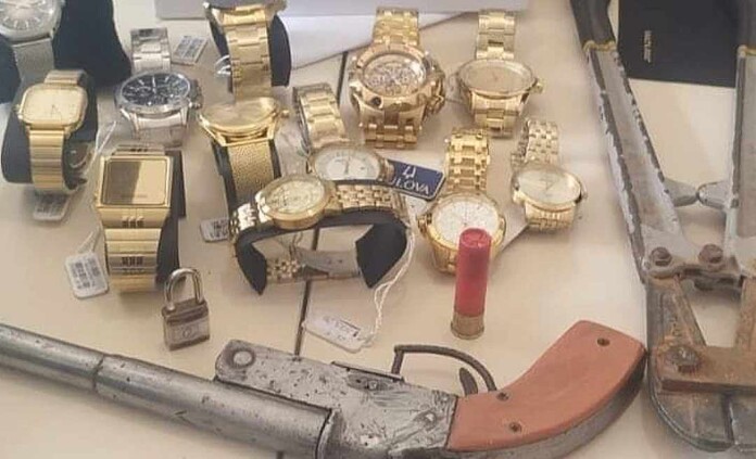 Em conversa com o suspeito, ele confessou ter cometido o crime junto de um comparsa e afirmou que tinha deixado os objetos do roubo em uma mochila de cor azul. Os policiais realizavam uma busca no interior da mochila e encontraram uma arma de fogo artesanal, 12 relógios, além de quantia em dinheiro.