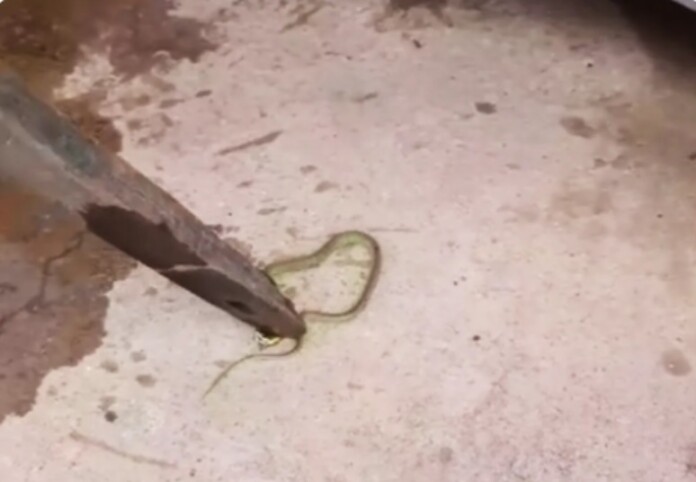 Após as reclamações, o equipamento foi aberto e encontraram o animal. Nas imagens, é possível ver o momento em que uma pessoa dá pauladas na cabeça do réptil. Não há informações sobre qual possa ser a espécie.