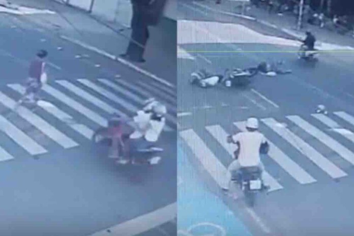 Um vídeo mostra uma mulher e uma menina de quatro meses sendo atropeladas por uma motocicleta na manhã desta terça-feira (26).