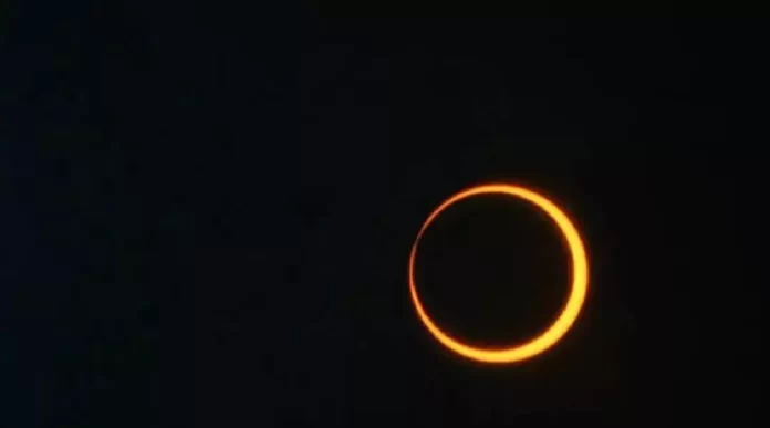O eclipse anular se caracteriza pelo alinhamento da Terra, da Lua e do Sol. A sobreposição resulta na formação de um “anel de fogo” em torno da silhueta da Lua, já que apenas as bordas do Sol ficam visíveis.