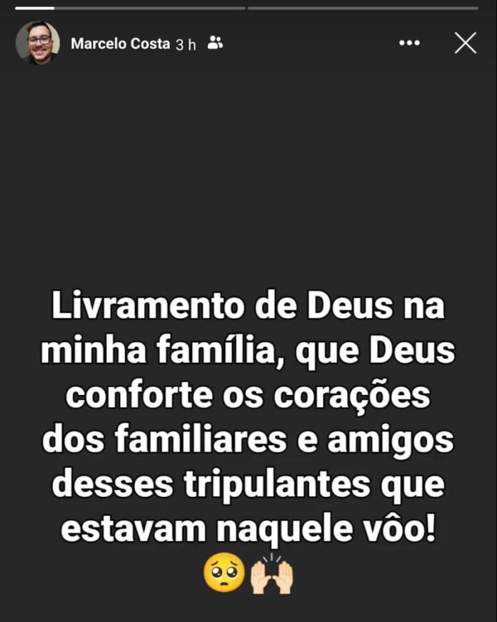 Nas redes sociais, o autônomo escreveu que foi um livramento de Deus na sua família e desejou que Deus confortasse todos os que perderam seus entes queridos nessa tragédia.