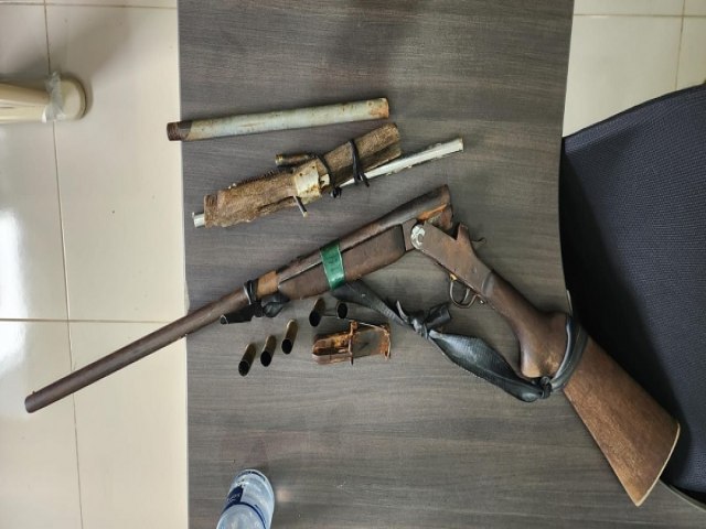O delegado José Obetânio solicitou o apoio da Polícia Militar para realizar o cumprimento de um mandado de prisão. Ao chegar no local os policiais fizeram uma incursão em uma área de mata, onde o indivíduo foi encontrado e com ele foram apreendidas uma espingarda e duas garruchas (armas artesanais).