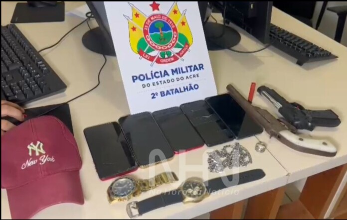 Os assaltantes Mateus Saldanha de Almeida, 23 anos, e João Vitor Silva de Souza, 24, foram presos acusados de roubo e porte ilegal de arma de fogo, na noite desta quarta-feira (17). A prisão aconteceu na Rotatória da Transacreana, na Via Verde, em Rio Branco.