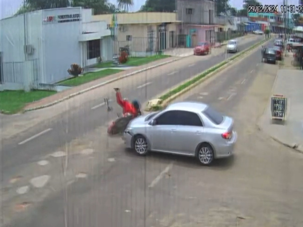 Na manhã desta quinta-feira, 29, uma câmera de um comércio registrou o exato momento em que uma moto colidiu contra um carro no centro de Mâncio Lima. O acidente aconteceu em um cruzamento, próximo ao prédio do Ministério Público do Acre, local de grande movimentação de veículos e pedestres.