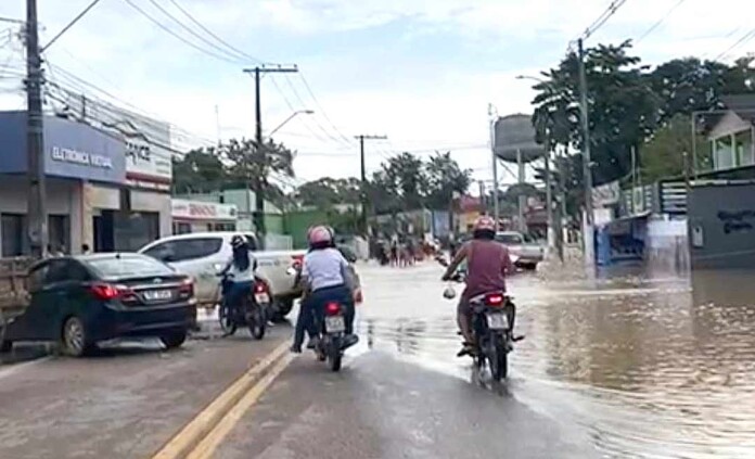 Parte da rua Doutor Pereira Passos, acesso ao Parque Capitão Ciríaco e ao bairro Seis de Agosto, ficou alagada na manhã desta segunda-feira (4) e impede a passagem de veículos.