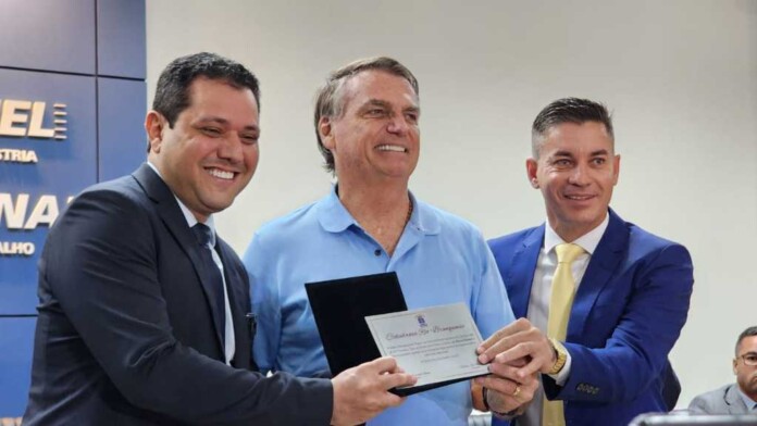 O ex-presidente Jair Bolsonaro recebeu, nesta sexta-feira (22), o Título de Cidadão Rio-branquense, pelo presidente da Câmara de Vereadores, Raimundo Neném, e vereador João Marcus Luz, propositor do título. A cerimônia acontece no auditório da Federação de Indústrias do Estado do Acre (Fieac), na capital acreana.