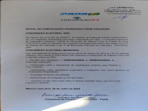Foi lançado o edital de convocação do PSDB e do Cidadania, que compõem a Federação, com o objetivo de escolher os candidatos a prefeito, vice-prefeito e vereadores.