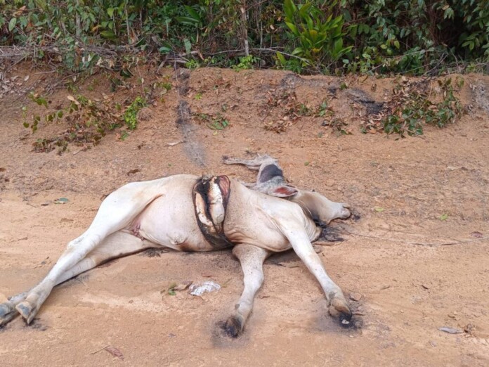 A corrente elétrica que saia do cabo de média tensão, deixou um grande ferimento no corpo do boi, que seria pertencente a um morador da comunidade.