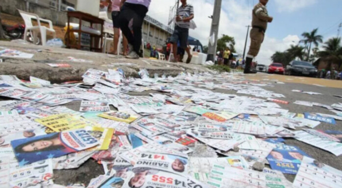 “A Lei das Eleições 9.504/97 proíbe a distribuição de material publicitário próximo aos locais de votação, considerando essa prática crime. As penalidades incluem multa e, em casos mais graves, pena de seis meses a um ano de prisão. Além disso, o descarte de ‘santinhos’ pode também ser enquadrado como crime ambiental”, destaca.