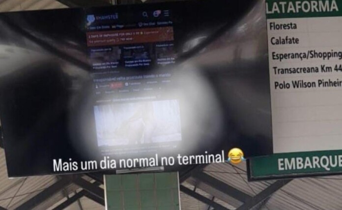 Na tarde desta quinta-feira (14), um fato inusitado e constrangedor marcou o Terminal Urbano de Rio Branco: a exibição de cenas de um filme pornô no telão que normalmente informa os horários de chegada dos ônibus. O incidente, que aconteceu na Plataforma B3 – responsável pelas linhas Floresta, Calafate, Esperança, Transacreana e Wilson Pinheiro – viralizou nas redes sociais, gerando revolta e indignação entre os usuários do transporte público.