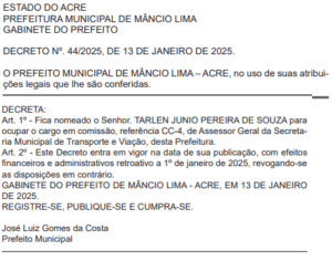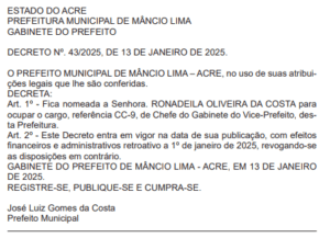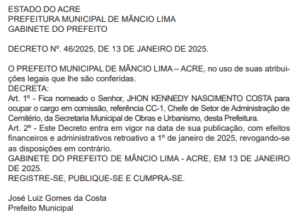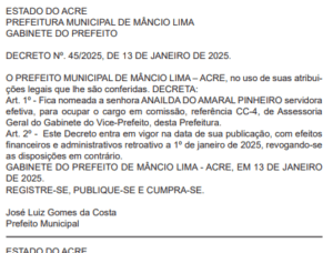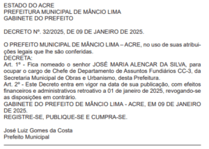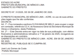 Desde o dia 1º de janeiro o prefeito Zé Luiz (Progressista) e o vice-prefeito Andinho (União Brasil) fazem nomeações para os cargos mais importantes da prefeitura de Mâncio Lima. Após nomearem os secretários em suas respectivas pastas, os gestores iniciaram as nomeações para os cargos de 2º e 3º escalão, que são alocados em partes estratégicas, visando, sobretudo, a continuidade e eficiência do serviço público.