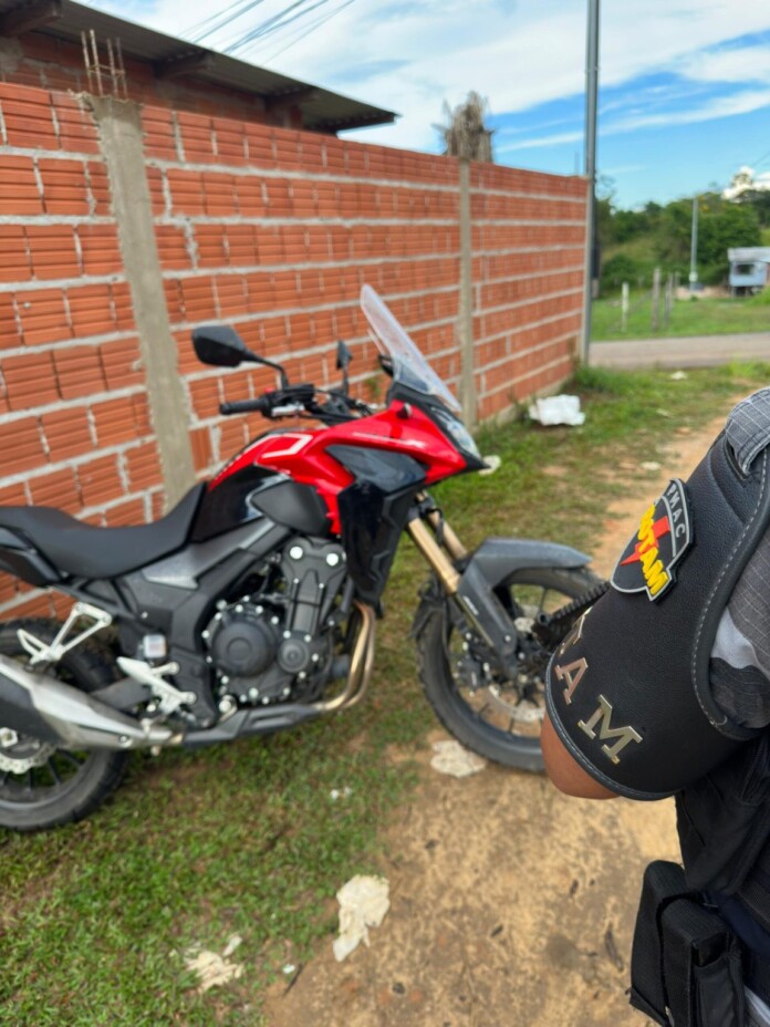 Durante o patrulhamento, os policiais localizaram uma motocicleta com as mesmas características informadas, aparentemente abandonada em uma rua deserta na comunidade Muniz, no bairro Remanso. Após consulta aos sistemas, foi constatado que o veículo, uma Honda CB 500X, havia sido roubado dias antes no bairro Cruzeirão e teria sido utilizado na prática do crime.