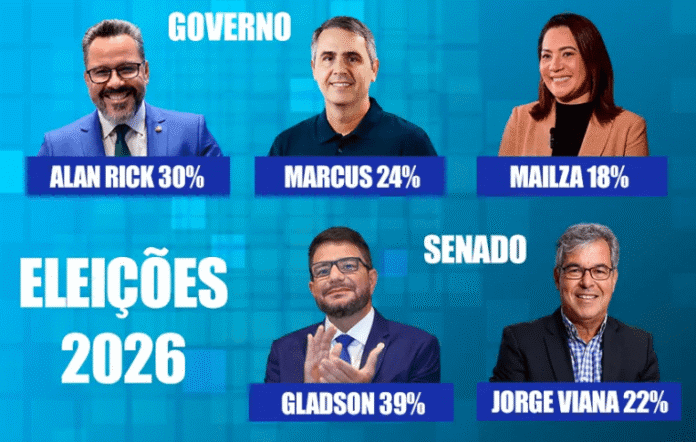 Um levantamento do Instituto Multidados, do Estado de Minas Gerais, foi divulgada nesta quarta-feira, 28, mostrando o cenário para disputa do governo e do senador no Acre visando as eleições de 2026. De acordo com a pesquisa estimulada para o executivo estadual, o atual senador Alan Rick (UB) aparece liderando as intenções de votos com 30% da preferência, seguido, seguido pelo ex-prefeito de Rio Branco, Marcus Alexandre (MDB) 24%.