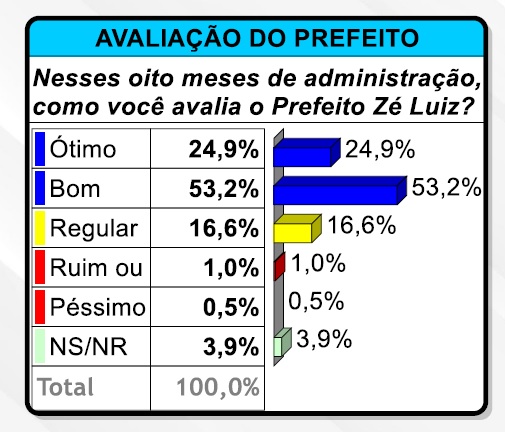 De acordo com a pesquisa do Instituto Data Control, o que mais acerta no município, Zé Luiz é aprovadopor 78% da população, sendo que 24,9% consideram a gestão de Zé Luizcomo Ótima e 53,2% da população consideram como Boa.