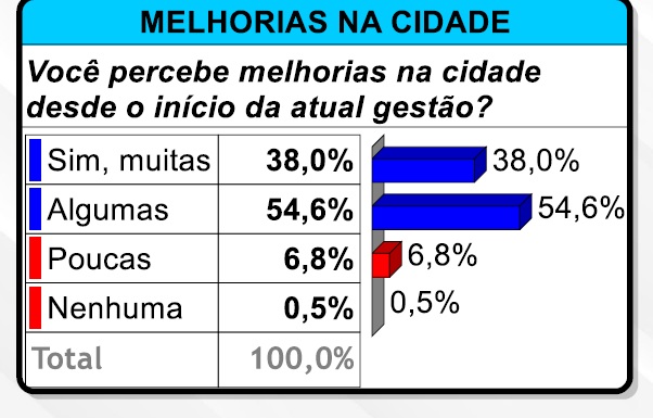 O Data Control também perguntou se o manciolimense notou melhorias no município nesses nove meses de gestão, e 38% das pessoas disseram que houve muitas melhorias, enquanto que 54,6% percebram algumas melhorias.