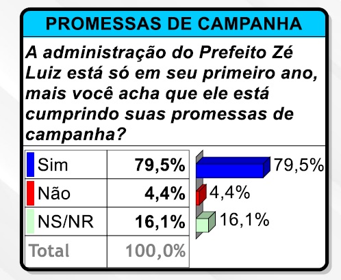Outro dado levantado pela pesquisa foi sobre as promessas de campanha de Zé. 79,5% disseram que o prefeito está cumprindo o que prometeu em campanha.