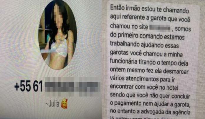 “Então, irmão, estou te chamando aqui referente à garota que você chamou no site. Somos do Primeiro Comando e estamos trabalhando ajudando essas garotas. Você chamou a minha funcionária tirando o tempo dela ontem. Fez ela desmarcar vários atendimentos para ir encontrar com você, sendo que não quer concluir o pagamento”.