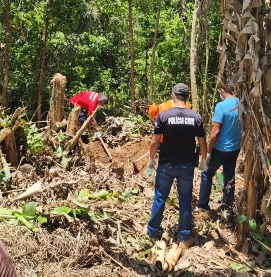 Durante o interrogatório, V.O.S. confessou ter ocultado o cadáver e indicou aos investigadores o local onde o enterrou. A escavação foi feita com pá, enxada, boca-de-lobo e carrinho de mão, ferramentas que, segundo a polícia, foram fornecidas por M.F., também presa em flagrante.