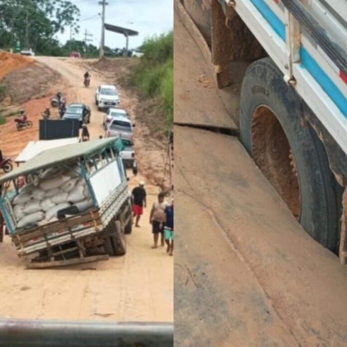 De acordo com informações locais, o problema ocorreu durante a travessia de um caminhão carregado com sacas de farinha. O veículo seguia da zona rural de Rodrigues Alves em direção a Cruzeiro do Sul quando, no meio do percurso, o casco da embarcação não resistiu ao peso e acabou sendo arrombado, provocando uma avaria significativa.