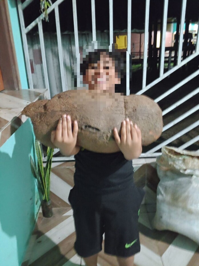 Uma imagem enviada à redação do jornal Extra do Acre mostra um garoto segurando uma macaxeira que, segundo informações, foi colhida por um agricultor na zona rural de Tarauacá, mais precisamente na comunidade do Gregório.