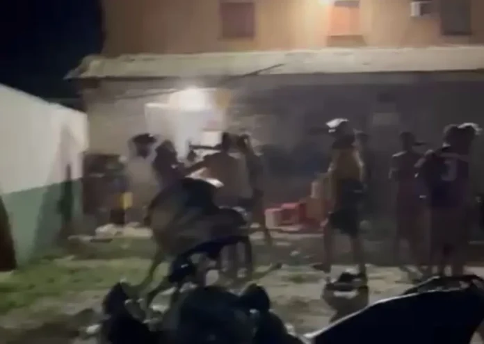 Segundo informações, a confusão começou após uma discussão entre pessoas que consumiam bebidas alcoólicas nas proximidades. O desentendimento rapidamente evoluiu para agressões físicas, com trocas de socos, chutes, golpes com capacete e até “voadoras”, em meio a gritos e empurra-empurra.