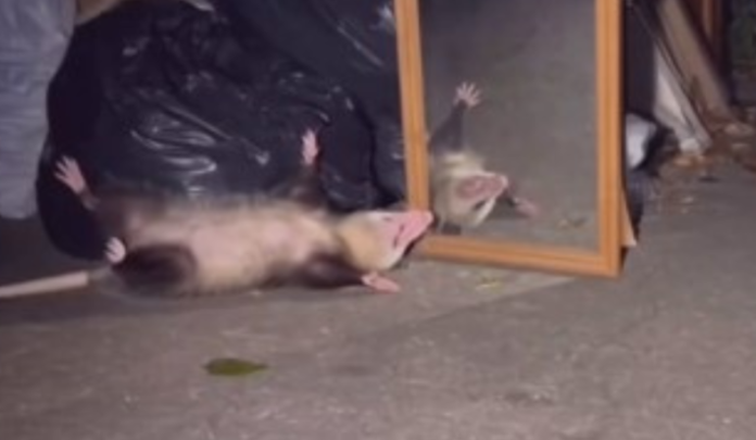 Uma mucura, também conhecida como gambá ou saruê se tornou a mais nova sensação das redes sociais ao protagonizar um momento hilário e inesperado. O animal foi filmado se deparando com o próprio reflexo em uma superfície e, em uma reação quase instantânea, “desmaiou”, caindo de lado no chão.