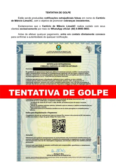 O Cartório da Comarca de Mâncio Lima emitiu um alerta importante à população após identificar uma tentativa de golpe usando o nome da instituição. Segundo o tabelião e oficial de registros, Kadial Cavalcante Martins, criminosos estão falsificando e enviando notificações extrajudiciais alegando supostas cobranças de direitos autorais.
