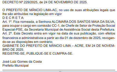 Para ocupar o cargo vago foi nomeada a senhora Alcimara dos Santos Maia da Silva. O decreto tem efeitos retroativos a partir de 01 de dezembro de 2025.